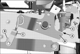 3. Check the gap (A) between the mower lift link (B) and height stop cam (C) on the machine. This measurement must be minimized to achieve maximum height-of-cut.