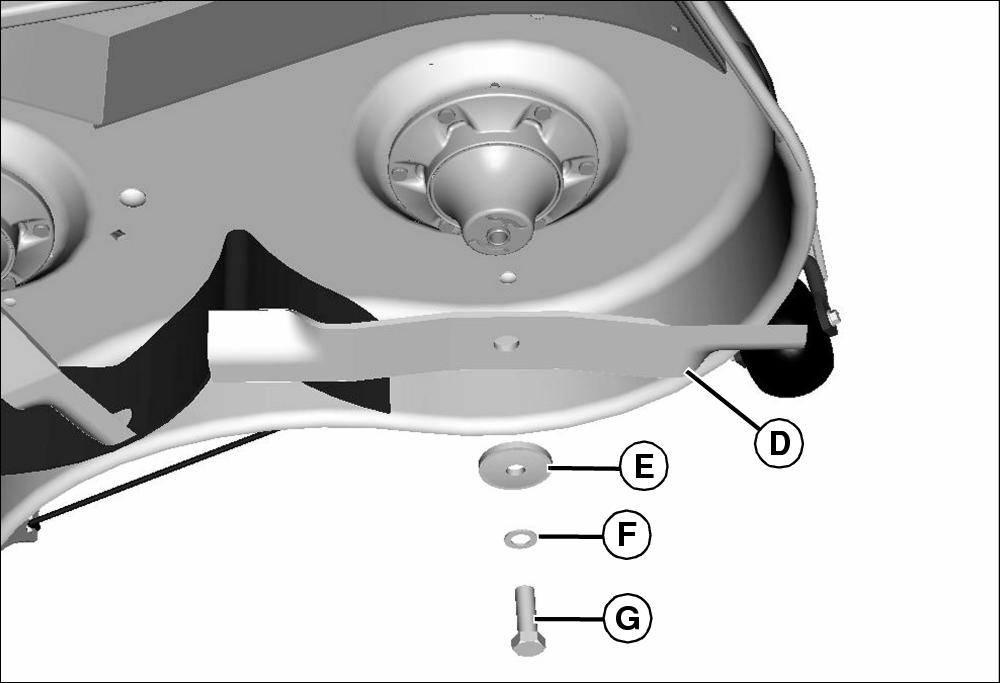 • 60D - Install blade (D) with cutting edge toward the ground, washer (E), washer (F) and bolt (G).