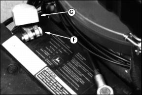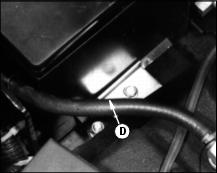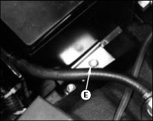 9. Install the battery. Install the hose in the hole of the battery base and through the hole in the side of the frame. Install the hold-down and screw (E) on each side of the battery.