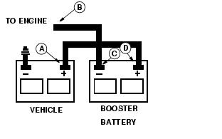 Connect positive (+) booster cable to booster battery positive (+) post (D).