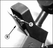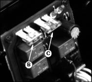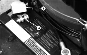 3. Pull the cover (B) away from the positive terminal. Loosen the bolt (C) and disconnect the cable.