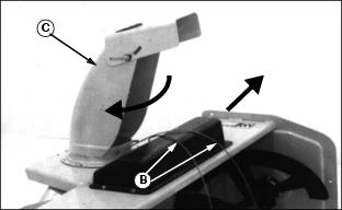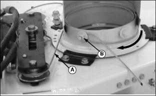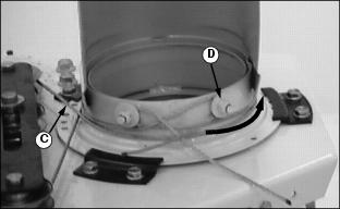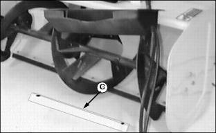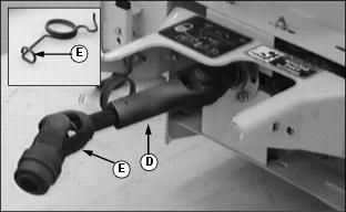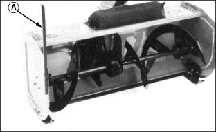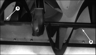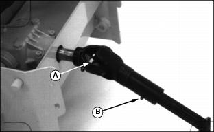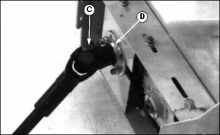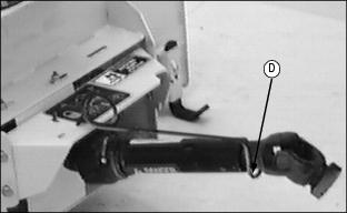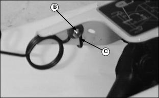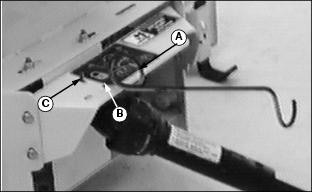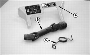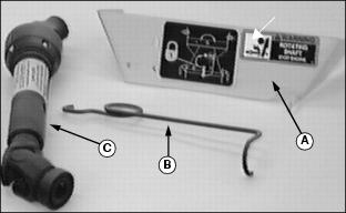 · 400 Series: Hook end (A) of PTO support rod under driveshaft shield and fasten with carriage bolt, washer (B), and lock nut (C). Bolt the support rod to the inside of the left-hand side of the shield.