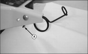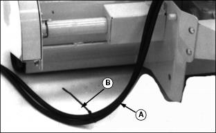 · F900 Series: Put end (A) of PTO support rod through square hole on driveshaft shield and fasten with carriage bolt, washer (B), and lock nut (C). Bolt the support rod to the outside of the right-hand side of the shield. Install Locking Pin with ChainWhen installing snowblower on front hitch, make sure front hitch cannot angle by installing locking pin in the front hole (A) on front hitch. Fasten with spring locking pin. When snowblower is removed from front hitch, put locking pin in storage hole (B). Fasten with spring locking pin. Install Tie Strap· 300 Series, 420, 430 and F900 Series: Put a loop (A) in snowblower hydraulic hoses and fasten with black tie strap (B). · 400 Series: Fasten snowblower hydraulic hoses (A) (without a loop) and fasten with black tie strap (B). 3. Install snowblower on front hitch and check for EQUAL turning of chute in BOTH directions. See Checking Discharge Chute Rotation in the Installing Section. Install Drift Blades (Optional Equipment)Install drift blade (A) (one on each side of snowblower shell) with two M6 x 20 mm hex head bolts and two M6 lock nuts. |