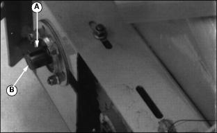 8. Tuck excess ends of cables under cable. 9. Install black cable shield and bracket with four bolts and lock nuts. Install Driveshaft (All Models)1. Install key (A) in gearbox shaft groove. 2. Apply John Deere NEVER SEEZ® lubricant or an equivalent on sprocket driveshaft (B). Picture Note: 400 and F900 Series Shown 3. Align groove in driveshaft (C) with key on sprocket shaft (D) and push driveshaft on sprocket shaft. Picture Note: 400 and F900 Series Shown 4. Align holes on sprocket shaft with holes in driveshaft and install rolled pin (E) through both shafts. Install wire (F) through rolled pin and twist both ends of wire a minimum of three turns. Lubricate DriveshaftLubricate driveshaft grease fittings with John Deere Moly High Temperature EP Grease or an equivalent as shown: Picture Note: 400 and F900 Series Shown · 400 and F900 Series: Lubricate two fittings (A) and one fitting (B). Picture Note: 400 and F900 Series Shown · 300 Series, 420 and 430: Lubricate two fittings (A). Lubricate Auger Shaft· Lubricate grease fittings (A) with John Deere Moly High Temperature EP Grease or an equivalent. Install Driveshaft Shield