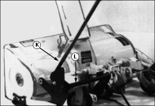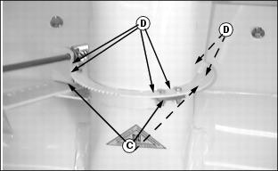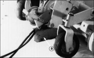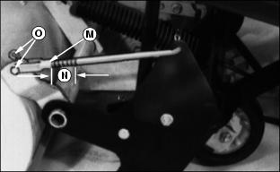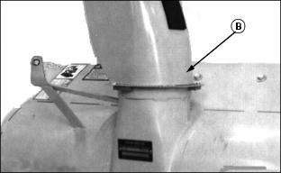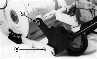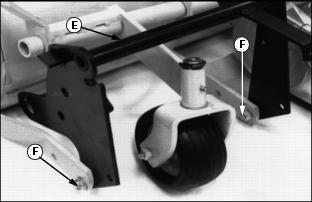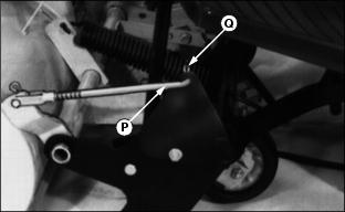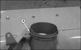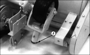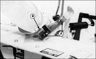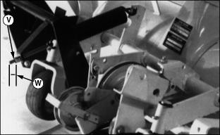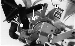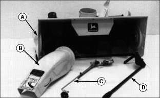 AssemblyIdentify PartsBag of PartsAssemble Snowthrower1. Apply John Deere Moly High Temperature EP Grease or an equivalent on chute base (A). 2. Put discharge chute (B) on base. 3. Fasten chute to base with three clips (C) and six M5 x 20 bolts and lock nuts (D). ˇ Remove lift bracket (E) from snowthrower. ˇ Remove two bolts M12 x 1.75 x 30 mm and lock nuts (F) from lift bracket. ˇ Install lift bracket to snowthrower pivot shaft (G). ˇ Install two bolts M12 x 1.75 x 30 mm and two lock nuts (H) through lift arm and bracket. Put in holes closest to snowthrower. DO NOT tighten. ˇ Install two bolts M12 x 1.75 x 30 mm and lock nuts (I) in holes closest to Front Mower. ˇ Tighten four bolts and lock nuts. 5. Install right caster wheel: ˇ Remove E-clip (J) from right caster wheel. ˇ Remove caster wheel assembly from spindle. Turn end for end. Insert caster wheel in spindle. ˇ Remove rubber cap from shaft on lift arm. ˇ Push lift handle (K) into shaft of lift bracket (L). Welded rivet on lift arm MUST slide into groove in lift bracket. ˇ Pull rearward until latch catches. ˇ Attach yoke (M) to threaded end of lift rod. Adjust rod to 28 mm (1-1/8 in.), length of exposed thread (N). (See Adjusting Lift Height in Operating Snowthrower section.) ˇ Insert one drilled pin and spring locking pin (O) through yoke and bracket. ˇ Push button on lift lever and push forward to release latch. ˇ Install lift rod (P) in lift bracket. 8. Install lift assist spring: ˇ Insert block of wood (R) under snowthrower bracket located under idler. ˇ Install spring (S) to snowthrower bracket (T). NOTE: Loosen upstop hardware before you install eye bolt. ˇ Install eye bolt (U) through other end of spring. NOTE: Threaded end of eye bolt MUST be facing Front Mower. ˇ Put threaded end of eye bolt through welded strap on lift bracket. NOTE: Make sure both nuts are located to back side of welded strap on lift bracket 9. Put two M10 nuts (V) on threaded end of eye bolt. 10. Adjust tension on eye bolt until Dimension (W) is 35-40 mm (1.4-1.6 in.). 11. Tighten second nut until it locks. Install Spout Control Rod1. Install two carriage bolts M8 x 1.25 x 25 and two flanged lock nuts (A) through spout control rod bracket and snowthrower bracket. 2. Position worm gear so grooves on gear mesh with teeth on discharge spout. 3. Put John Deere Moly High Temperature EP Grease or an equivalent on worm gear (B). 4. Spout MUST rotate freely when turning crank handle. 6. If snowthrower spout starts rotating on its own while blowing snow, turn nut under black tension block up to adjust tension. 7. Adjust runners. (See Adjusting Runners in Operating section.) Install Reflective TapeNOTE: Reflective tape is in Front Mower operator's manual bag. Install piece of reflective tape (A) in center of Front Mower hood. NOTE: Adjust upstop to 2-5 mm (0.078-0.197 -in.). (See Adjusting Upstop in Operating Snowthrower section.) |