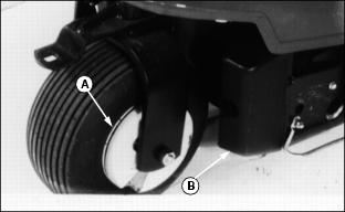 1. Rear wheel weights (A) and frame weights (B). NOTE: Rear wheel weights and frame weights are standard equipment. 2. The following OPTIONAL EQUIPMENT is recommended: (See Operating section.) ˇ TIRE CHAINS: Drive wheels must be in the WIDE position. Flipping over wheels will increase or decrease distance between drive wheels. ˇ FRONT WHEEL WEIGHTS: Drive wheels should be in the WIDE position. Flipping over wheels will increase or decrease distance between drive wheels. |
