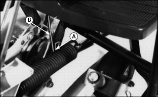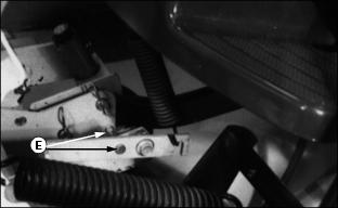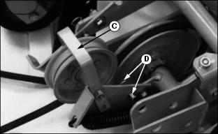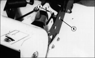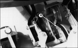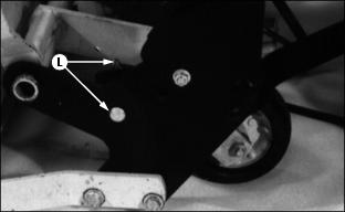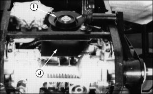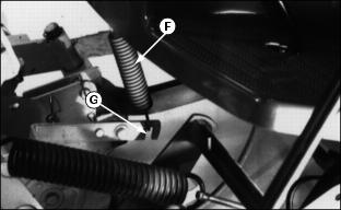 RemovingPark Vehicle Safelyˇ Stop vehicle on a level surface, not on a slope. ˇ Before you leave the operator's seat, wait for engine and all moving parts to STOP. Removing Snowthrower1. Remove weight transfer cable: ˇ Raise snowthrower with lift handle. ˇ Remove drilled pin and spring locking pin (A). ˇ Remove cable (B) from lift bracket. ˇ Grasp handle (C) and pull forward to release belt tension. NOTE: Use spring locking pin and drilled pin removed above. ˇ Insert drilled pin and spring locking pin (D). 2. Remove weight transfer spring: NOTE: Pull up on spring bracket while removing pin. ˇ Remove one drilled pin and spring locking pin (E). ˇ Remove spring (F) from bracket (G). ˇ Remove other end of spring from S-hook. ˇ Lower snowthrower to ground. ˇ Roll belt from top of drive sheave (H). ˇ Remove belt from drive sheave (I) and belt guard plate (J), if your model Front Mower has this plate. If your model Front Mower does not have this plate, go to Step 4. ˇ Remove two drilled pins and spring locking pins (K). ˇ Remove two drilled pins and spring locking pins (L). ˇ Tie push arms up to Front Mower before pulling snowthrower from Front Mower. ˇ Pull snowthrower forward from Front Mower.
