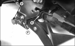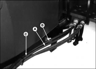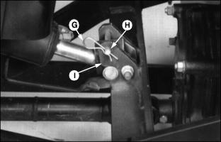 RemovingPark Vehicle Safelyˇ Stop vehicle on a level surface, not on a slope. ˇ Before you leave the operator's seat, wait for engine and all moving parts to STOP. Avoid High Pressure Fluidsˇ Hydraulic hoses can fail due to physical damage, kinks, age, and exposure. Check hoses regularly. Replace damaged hoses. ˇ Escaping fluid under pressure can penetrate the skin causing serious injury. Avoid the hazard by relieving pressure before disconnecting hydraulic or other lines. Tighten all connections before applying pressure. ˇ Search for leaks with a piece of cardboard. Protect hands and body from high pressure fluids. ˇ If an accident occurs, see a doctor immediately. Any fluid injected into the skin must be surgically removed within a few hours or gangrene may result. Doctors unfamiliar with this type of injury should reference a knowledgeable medical source. Such information is available from Deere & Company Medical Department in Moline, Illinois, U.S.A. Removing Snowblower.1. Park snowblower at storage area. 3. Lower snowblower to ground. 5. Move hydraulic levers back and forth to relieve hydraulic pressure. 6. Pull coupler sleeves back to disconnect hydraulic chute rotation hoses (A) and (B). 7. Install dust plugs in couplers and dust caps on hoses. 8. Remove hydraulic hoses from hose guide (C). 9. Put spring pins (D) in locked position. (Not engaged into mounting bracket.) 10. Pull locking collar (E) to disconnect drive shaft (F). 11. Remove spring pin (G) and drilled pin (H). 12. Raise lift bracket latch (I). 13. Back tractor away from snowblower.