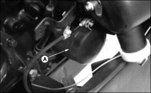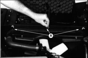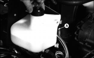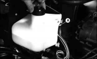 1. Fill cooling system with clean water and John Deere Cooling System Cleaner, or John Deere Cooling System Quick Flush or an equivalent. Follow directions on can. 2. Install and tighten radiator cap. 3. Start and run engine until it reaches operating temperature. 4. Drain cooling system immediately before rust and dirt settle. 6. Remove and clean recover tank (A). 7. Install tank after cleaning. 8. Fill cooling system. (See Filling Cooling System this section.) Filling Cooling System