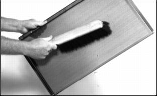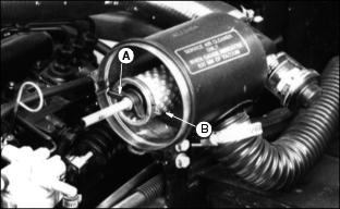 2. Remove wing nut (A) and cover (B). 3. Remove and discard wing nut and washer (C). 4. Remove and discard old primary element (D). 5. Wipe dirt from inside of cannister with a soft cloth. 6. Install new primary element. 7. Install new wing nut and washer. 9. Install old cover with washer and wing nut. 11. Depress reset button (E) on air restriction indicator (F) and then release to reset. 12. Start engine and allow it to run a minute at maximum speed. 13. STOP engine and check air restriction indicator. If indicator shows 500 mm (20 in) or more vacuum, replace secondary element. Replacing Secondary Element1. Remove primary element. (See Replacing Primary Element in this section.) 2. Remove wing nut (A) and secondary element (B). 3. Install new secondary element. 4. Install washer and wing nut.