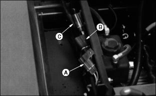 Service ElectricalCleaning Or Replacing Battery3. Disconnect black negative (-) cable (A) from battery first. 4. Open positive terminal cover (B). 5. Disconnect red positive (+) cable (C). 6. Clean battery with a damp cloth or rag. Keep dirt out of battery cells. 7. Remove corrosion from terminals and cable clamps with a wire brush. 8. If necessary, remove battery to thoroughly clean it: ˇ Loosen cap screw (D) to remove battery hold-down (E). ˇ Disconnect overflow tube from manifold cell cap. 9. Clean battery, battery terminals, cable ends, battery box, and other parts with a solution of 1 part baking soda to 4 parts water. KEEP solution out of battery cells. 10. Rinse all parts with clean water and let dry. NOTE: If you need a new battery, install a John Deere battery or a battery of equal specification. (See your John Deere dealer.) 11. Install battery and battery hold-down. (See Install Battery in Assembly section.) 13. Connect overflow tube to manifold cell cap. 14. Connect red positive cable (+) to battery. 15. Close positive terminal cover. 16. Connect black negative cable (-) to battery. Make sure connections are tight. 17. Apply petroleum jelly or silicone spray to terminals to prevent corrosion Checking Battery Electrolyte Level2. Remove battery manifold cap (A).