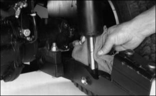Storing VehicleStoring SafetyStoring Engine1. Add John Deere storage stabilizer or equivalent to fuel tank. Follow directions on can. 2. Run engine 10 minutes so stabilizer reaches carburetor. 3. Change engine oil when engine is warm. (See Changing Engine Oil in Service - Engine section.) 4. Remove spark plugs. Put 30 ml (1 oz) of clean engine oil into cylinders. 6. Turn key to crank engine five or six times. 8. Clean the engine and the area around it: remove oil, grease, and dirt. 9. Apply paint on parts of the engine that need it to prevent rust. Storing Front Mowerˇ Check electrolyte level. (See Checking Battery Electrolyte Level in Service - Electrical section.) ˇ Charge battery. (See Charging Battery in Service - Electrical section.) ˇ Store battery in a cool, dry place. 2. Repair worn or damaged parts. Replace parts if necessary. 5. Apply paint on areas that need it to prevent rust. 6. Apply multipurpose grease on exposed lift cylinder rod. Lubricate grease points. (See Lubricate Lift Cylinder in service section.) 7. Release hydraulic pressure: Move hydraulic control lever back and forth. 8. Store Front Mower in a dry, protected place. If Front Mower is stored outside, put a waterproof cover over it. Your John Deere dealer has a storage cover to fit Front Mower. 9. Put blocks or support stands under Front Mower to take weight off tires. Let 1/3 of air out of tires. Removing Front Mower From Storage2. Remove blocks or supports from under Front Mower. 4. Wipe grease off cylinder rods. 5. Check battery electrolyte level. Charge battery if necessary. Install battery. 6. Check spark plug gap. Install and tighten plugs to 20 Nˇm (15 lb-ft). 7. Lubricate all grease points. (See Service - Miscellaneous section.) |