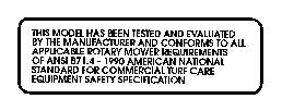 Safety SignsSafety-Alert SymbolRead and recognize safety information. Be alert to the potential for personal injury when you see this safety-alert symbol. On your machine safety labels, the words DANGER, WARNING, and CAUTION are used with this safety-alert symbol. DANGER identifies the most serious hazards. In this manual, the work CAUTION and this symbol call attention to safety messages. Machine Safety LabelsMachine Safety Labels Continued:Machine Safety Labels Continued:Compliance LabelThis label on your machine indicates that this model has been tested and evaluated by the manufacturer and conforms to rotary mower requirements of the American National Standard B-71.4.1990 for Commercial Turf Care Equipment Safety Specification. Certification LabelThis label on your machine indicates that this ROLL-OVER PROTECTIVE STRUCTURE was performance certified at date of manufacture to OSHA:29 DFR Subpart C. |