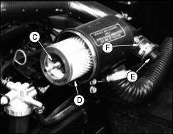 11. Depress reset button (E) on air restriction indicator (F) and then release to reset.