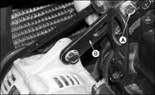 2. Loosen fan belt by sliding alternator bracket (B) torwards engine.