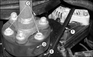 4. Remove three cap screws (C) holding vibration dampener (D) to engine pulley (E).