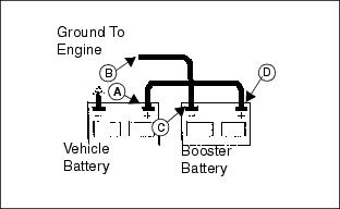 Connect the other end of positive Connect negative (-) booster cable to booster battery negative (-) post (C).