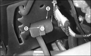 Service ElectricalCleaning Or Replacing Battery3. Disconnect black negative (-) cable (A) from battery first. 4. Open positive terminal cover (B). 5. Disconnect red positive (+) cable (C). 6. Clean battery with a damp cloth or rag. Keep dirt out of battery cells. 7. Remove corrosion from terminals and cable clamps with a wire brush. 8. If necessary, remove battery to thoroughly clean it: ˇ Loosen cap screw (D) to remove battery hold-down (E). ˇ Disconnect overflow tube from manifold cell cap. 9. Clean battery, battery terminals, cable ends, battery box, and other parts with a solution of 1 part baking soda to 4 parts water. KEEP solution out of battery cells. 10. Rinse all parts with clean water and let dry. NOTE: If you need a new battery, install a John Deere battery or a battery of equal specification. (See your John Deere dealer.) 11. Install battery and battery hold-down. (See Install Battery in Assembly section.) 13. Connect overflow tube to manifold cell cap. 14. Connect red positive cable (+) to battery. 15. Close positive terminal cover. 16. Connect black negative cable (-) to battery. Make sure connections are tight. 17. Apply petroleum jelly or silicone spray to terminals to prevent corrosion Checking Battery Electrolyte Level2. Remove battery manifold cap (A).