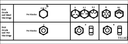 Fasteners should be replaced with the same or higher grade. If higher grade fasteners are used, these should only be tightened to the strength of the original. Make sure fasteners threads are clean and that you properly start thread engagement. This will prevent them from failing when tightening. Tighten plastic insert or crimped steel-type lock nuts to approximately 50 percent of the dry torque shown in the chart, applied to the nut, not to the bolt head.
