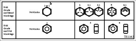 b Grade 2 applies for hex cap screws (not hex bolts) up to 152 mm (6-in) long. Grade 1 applies for hex cap screws over 152 mm (6-in) long, and for all other types of bolts and screws of any length.