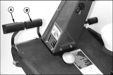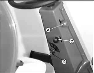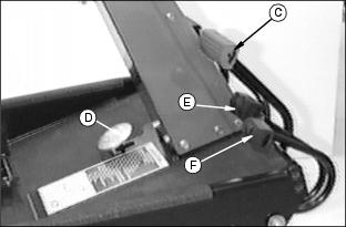 ControlsDash ControlsA - Hydraulic Control Lever - Raises and Lowers Attachments B - Throttle Lever - Controls Engine Speed C - PTO Switch - Engages Attachments (Rocker switch--150001-160000) (Toggle switch--160,001- ) D - Weight Transfer Valve (F935) - Optional (F925) Miscellaneous ControlA - Fuel Tank Supply Lever (F935) Foot Platform ControlsC - Park Brake Pedal - Engages Park Brake D - Differential Lock Pedal - Push for improved traction E - Forward Travel Pedal - Starts machine travel F - Reverse Travel Pedal - Backs machine Console Controls |