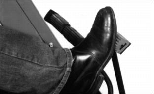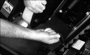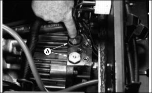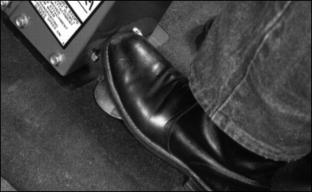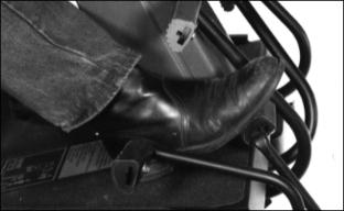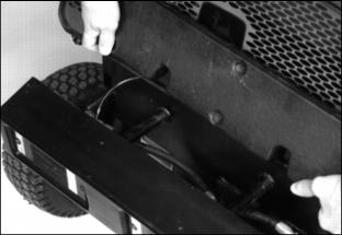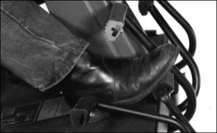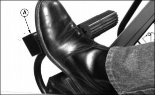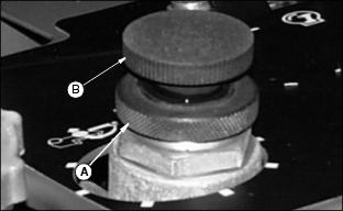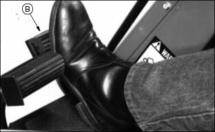 1. Start engine. (See Starting Engine in Operating Engine section.) 2. Push hydraulic lift lever all the way forward to lower attachment to the surface. 3. Push service-brake pedal all the way down. 4. Put park brake knob (A) in top of slot (UNLOCKED position). 6. Move throttle lever all the way forward to FAST position. · Slowly push speed control pedal down: - The farther you push the pedal down the faster the Front Mower will travel. · Forward travel speed is 0-17 Km/h (0-10.6 mph). · Let Front Mower slow down from forward travel. · Carefully check area behind Front Mower. · Slowly push speed control pedal down: - The farther you push the pedal down, the faster the Front Mower will travel. · Reverse travel speed is 0-8.5 Km/h (0-5.3 mph). Engaging PTO· (Serial number 150,001 - 160,000) NOTE: Front mowers with serial numbers of 150,001 - 160,000 have a three-position rocker switch to engage the PTO. 1. Push throttle lever (A) to midpostion. 2. Push front of PTO switch (B) down to engage PTO. 3. Push throttle lever (A) all the way forward to operate engine at maximum speed. NOTE: Front mowers with serial number 160,001 and up have a three-position toggle switch to engage the PTO. 1. Push throttle lever (A) to midpostion. 2. Pull up on toggle switch (B). 3. Hold switch up and push completely forward to engage PTO. 5. Push throttle lever (A) all the way forward to operate engine at maximum speed. Disengaging PTO· (Serial number 150,001 - 160,000) NOTE: Front mowers with serial numbers of 150,001 - 160,000 have a three-position rocker switch to engage the PTO. Push rear of PTO switch (A) down or depress service park brake pedal to DISENGAGE PTO. NOTE: Front mowers with serial number 160,001 and up have a three-position toggle switch to engage the PTO. Push toggle switch (A) to the rear or depress service park brake pedal to disengage PTO. Using Cruise Control (F935) (Optional F925)NOTE: The Cruise control operates only in forward travel. · Hold cruise control lever (A) up. · Push forward speed control pedal at least 1/3 of the way down. · Remove foot from forward speed control pedal. · Remove hand from cruise control lever. · Tap forward speed control pedal. · Pull down on cruise control lever (A) OR · Depress service-park brake pedal. Operate Front Mower in a large, open area to learn how the controls work. Operating Differential LockLOCK the differential for better traction on slopes and in slippery places. · Differential will stay LOCKED as long as you hold pedal down or as long as wheel slip is unequal. Stopping the Front Mower· Use step (A) to dismount safely. Using Turn Brake Pedals