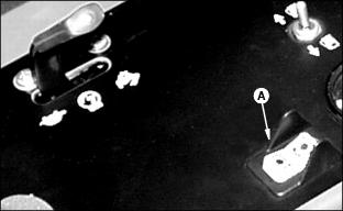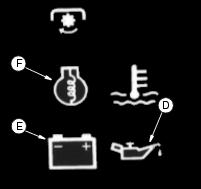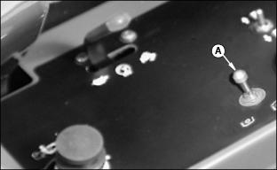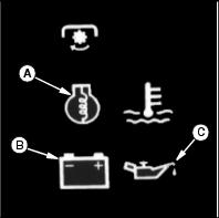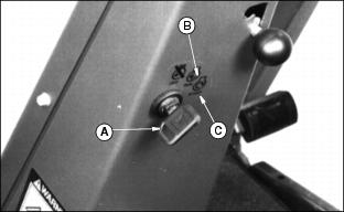 The oil pressure indicator light (A) will come on when the engine oil pressure is too low. 1. If the oil pressure indicator comes on during operation, STOP engine. 2. Check engine oil level. (See Checking Engine Oil Level in Service Engine section.) Add oil if necessary. 3. Start engine. If indicator is still on, DO NOT operate Front Mower. STOP engine and see your John Deere dealer. Battery Discharge IndicatorThe battery discharge indicator light (A) will come on when alternator output is too low. 1. If the battery discharge indicator comes on during operation, move throttle to FAST position. STOP engine if light remains on. 2. See Electrical System in Troubleshooting section to determine the cause. If problem cannot be corrected, see your John Deere dealer. Water Temperature IndicatorThe water temperature indicator light (A) will come on when engine coolant in radiator is above 220°F (107°C). 1. If the water temperature indicator comes on during operation, STOP engine. 2. See Engine in Troubleshooting section to determine the cause. If problem cannot be corrected, see your John Deere dealer. Using Park Brake· Move knob (A) to the bottom (C) of the slot. · Push park brake pedal down. Pedal will stay down. · Move knob (A) to the top (B) of the slot. Stopping Front MowerFor normal stopping, release foot from speed control pedal. If unit creeps, push down on service-park brake. If unit continues to creep, see you John Deere dealer. Disengage PTO and LOCK park brake. Emergency StoppingPush hard on service-park brake pedal: · PTO will automatically DISENGAGE. Engine Warm-Up
