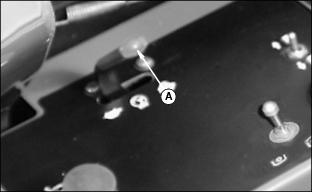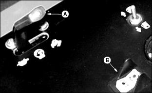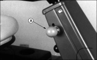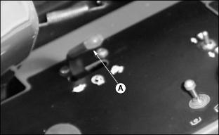 Use a heavy-duty trailer to transport your machine. 1. Drive machine forward onto the trailer. Lower any attachments to trailer deck. 3. Fasten machine to trailer with heavy-duty straps, chains, or cables. Both front and rear straps must be directed down and outward from machine. 4. Trailer must have signs and lights required by law. 5. Make sure Front Mower hood is latched securely. 6. Fasten hood with hood strap. Pushing Front MowerTo move Front Mower when engine is not running: · Push down and hold two buttons (A) to disconnect transmission. · Push Front Mower to desired location. · Two buttons will come back up when you start engine. Using Drawbar Hitch (Optional)· Using the appropriate adapter parts, attach the chain to the Front Mower drawbar support or other specified anchor location. · Provide only enough slack in the chain to permit turning. · See your John Deere dealer for a chain with a strength rating equal to or greater than the gross weight of the towed machine. · Use the drawbar hitch to pull only light trailers or other attachments. · The maximum towed weight that can be used with the drawbar hitch is 409 kg (900 lbs). · The maximum tongue weight must not exceed 45 kg (100 lbs). |