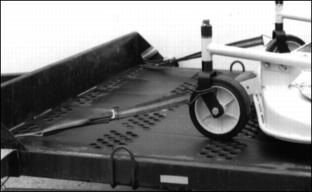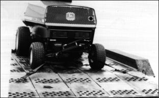 Turn brake pedals can be used for tighter turns. Using the turn brake pedals may also avoid unnecessary backing of Front Mower. · Push down on turn brake pedal (A). · Push down on turn brake pedal (B). Using Tool BoxStore operator's manual and necessary hand tools in tool box. Using Weight Transfer Valve (F935) (Optional F925)1. With engine running, push hydraulic lift lever completely forward to FLOAT position. 2. Turn valve lock knob (A) counterclockwise to unlock adjusting knob (B). 3. Turn adjusting knob (B) clockwise until mower or other attachment lifts off the ground. (This may require an assistant as it is hard to notice from the operator's seat.) 4. Turn adjusting knob (B) counterclockwise slowly until mower front wheels or other attachment just touches the ground; then turn knob slightly counterclockwise. 5. Turn lock knob (A) clockwise to lock adjusting knob. 6. Operate mower or other attachment over uneven terrain at desired travel speed and observe mower front wheels or front of other attachment. If wheels or attachment do not follow ground contour, operation will be affected. To correct this condition, do Step 7 and 8. 7. Turn valve lock knob (A) counterclockwise to UNLOCK valve. 8. Turn adjusting knob (B) clockwise slightly until mower front wheels or attachment follow ground contour. 9. Turn valve lock knob clockwise to LOCK position after final adjustment. Using Reserve Fuel System (F935)The F935 Front Mower is equipped with two fuel tanks. Before each use, check level in fuel tanks: · Move switch (A) to the left. · Check fuel gauge (B) for proper fuel level in left tank. · Move switch to the right to check right tank. If engine starts to stall, move fuel supply lever (C) to other fuel tank position: · Move lever to the "L" position. This will let you use fuel from the left tank. · Move lever to the "R" position. This will let you use fuel from the right tank. Use most of the fuel from one tank before switching to the other tank. When one tank is near empty, get it filled as soon as possible. To STOP fuel from getting into the engine: · Move fuel supply lever between "R" and "L" position. If engine quits running because fuel tanks are empty: · Bleed injection pump and lines. (See Bleeding Injection Pump And Lines in Service Engine section.) DAILY OPERATING CHECKLIST4 Remove grass and debris from machine. TESTING SAFETY SYSTEMSUse the following checkout procedure to check for normal operation of tractor. If there is a malfunction during one of these procedures, DO NOT operate machine. (See your John Deere dealer for service.) Perform these tests in a clear open area. Keep bystanders away. Test 1Check operation of indicator lights: · LOOK: Indicator light (A) will come on and go out within approximately 8 seconds. If the engine has been run and then cooled, the time may be less. If the engine has been run and is hot, the light will not come on. · LOOK: Indicator lights (B) and (C) must light. · If one indicator does not light, see Replacing Indicator Light Bulb in SERVICE-ELECTRICAL section. · If new indicator bulb does not light or no indicators work, see your John Deere dealer. Test 21. Unlock park brake and release brake pedal. 2. Raise up off of seat and hold there with weight off of seat cushion. 3. Turn key to START position. Test 3· Start engine. Run engine at MAXIMUM engine speed. · Unlock park brake and release brake pedal. · Put PTO switch in ON position. · Raise up off seat. DO NOT get off tractor. · Engine should begin to die. PTO should immediately SHUT OFF and mower blades should STOP. · Raise up off seat. DO NOT get off tractor. · Raise up off seat. DO NOT get off tractor. · Engine should continue to run. Test 4NOTE: Operator must be on the seat. Engine is not running and park brake and PTO are disengaged. 1. Sit on operator's seat with engine off. 4. Depress park brake pedal and start engine. 7. Push down on park brake pedal. PTO must stop. 8. Release park brake. PTO must not restart automatically after releasing park brake. PTO may be restarted only by using the PTO switch. Using Front Wheel Weights (Optional)Install front wheel weights when operating on slopes or slippery surfaces to increase traction, stability, braking and steering control. One 23 kg (50 lb) weight can be attached to each wheel on the F935 Front Mower. Installation instructions are included with weights. Using Rear Frame Weights (Optional)Rear frame weights are recommended for use with attachments listed below. Installation instructions are included with weights. Using Liquid WeightLiquid weight may be used along with front and rear cast iron weights. Add the same amount of liquid weight to each front or each rear tire. A tire with liquid weight needs an inner tube. Use the correct amount of calcium chloride (shown on chart) to prevent water from freezing. Avoid Damage To Plastic And Painted Surfaces· Insect repellent spray may damage plastic and painted surfaces. Do not spray insect repellent near machine. · Be careful not to spill fuel on machine. Fuel may damage surface. Wipe up spilled fuel immediately. Transporting Front Mower On A Trailer