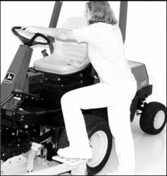 OperatingOperate Safely· Check brake action before you operate. Adjust or service brakes as necessary. · Clear work area of objects that might be thrown. Keep people and pets out of the work area. Stop machine if anyone enters the area. · If you hit an object, stop the machine and inspect it. Make repairs before you operate. Keep machine and attachments properly maintained and in good working order. Keep all shields and guards in place. · DO NOT leave machine unattended when it is running. · Only operate during daylight or with good artificial light. · Be careful of traffic when operating near or crossing roadways. · Do not wear radio or music headphones while operating the machine. Safe operation requires your full attention. Park Safely· Stop machine on a level surface, not on a slope. · Lower attachments to the ground. · Before you leave the operator's seat, wait for engine and all moving parts to STOP. Rotating Blades Are Dangerous - Protect Children And Prevent Accidents· Never assume that children will remain where you last saw them. Children are attracted to mowing activity, stay alert to the presence of children. · Keep children in the house when you are operating the machine. · Turn machine off if a child enters the mowing area. · Use extra care when you come to blind corners, shrubs, trees, or other objects that may block your vision. · DO NOT let children or untrained person operate the machine. · DO NOT carry or let children ride on machine or any attachment. DO NOT tow children in a cart or trailer. HELP PREVENT SERIOUS OR FATAL ACCIDENTS: · Be alert at all times, drive forward carefully. People ESPECIALLY CHILDREN can move quickly into the mowing area before you know it. · Back carefully. Shut off PTO and look behind the machine carefully, ESPECIALLY FOR CHILDREN, before you back up. · DO NOT mow in reverse unless it is absolutely necessary. · Shut off PTO when you are not mowing. · DO NOT operate machine if you are under the influence of drugs or alcohol. Use Seat Belt ProperlyUse a seat belt when you operate with a roll-over protective structure (ROPS) or cab to minimize chance of injury from an accident such as an overturn. Do not use a seat belt if operating without a ROPS or cab. Avoid Tipping· DO NOT drive where machine could slip or tip. · Stay alert for holes and other hidden hazards in the terrain. · Slow down before you make a sharp turn or operate on a slope. · When pulling loads or using heavy equipment, use only approved hitches, limit loads to those you can safely control, and use counterweights or wheel weights when required per this manual or your attachment manual. · Drive up and down a hill - not across. Be careful when you change direction on a slope. · DO NOT stop when going up hill or down hill. If machine stops going up hill, STOP PTO and back down slowly. · DO NOT mow wet grass. Reduced traction could cause sliding. · DO NOT try to stabilize the machine by putting your foot on the ground. Operator Training Required· Study operation section of this manual before operating the machine. · Operate machine in an open, unobstructed area under the direction of an experienced operator. · Learn the use of all controls. · Operator experience is required to learn the moving, stopping, turning and other operating characteristics of the machine. Keep Riders Off· Only allow the operator on the machine. Keep riders off. · Riders on the machine or attachment may be struck by foreign objects or thrown off the machine causing serious injury. · Riders obstruct the operator's view resulting in the machine being operated in an unsafe manner. Mount And Dismount Safely· Use mower step when you mount or dismount. · Keep step and platform clean. Wear Appropriate Clothing· Wear close fitting clothing and safety equip- ment appropriate for the job. · Loud noise can cause impairment or loss of hearing, wear a suitable protective device such as earplugs. Stay Clear Of Rotating DrivelinesEntanglement in rotating driveline can cause serious injury or death: · Wear close fitting clothing. · STOP the engine and be sure PTO driveline is stopped before getting near it. Check Wheel Bolts· A serious accident could occur causing serious injury if wheel bolts are not tight. · Check wheel bolt tightness often during the first 100 hours of operation. Transport Safely· Use safety lights and devices. Slow moving machines when driven on public roads are hard to see, especially at night. Avoid personal injury or death resulting from a collision with a vehicle. · Whenever driving on public roads, use flashing warning lights and turn signals according to local regulations. Extra flashing warning lights may need to be installed. Lifting Seat Platform1. Push and hold left or right side lock lever to the rear. 2. Lift up rear of seat to pivot seat platform up to service position. 3. Latch seat platform securely in raised position before working underneath it. Lowering Seat Platform2. Pull and hold release lever forward to release seat platform latch. 3. Lower seat all the way down until secured with lock lever. Adjusting Seat1. Move lever (A) to the left and slide seat forward or rearward to the most comfortable position. 2. Release lever to LOCK seat in position. 3. Turn knob (B), (in front of seat cushion) clockwise for heavier operators, counterclockwise for lightweight operators. If seat suspension "bottoms out" during normal operation, turn knob farther clockwise. Indicator Lights And Gauges· PTO indicator (A) will come on when PTO is engaged. · Engine Preheat indicator (B) will come on for up to 8 seconds when starting the engine. If the engine has been run and then cooled, the time maybe less. If engine has been run and is hot the light will not come on. · Battery Discharge indicator (C) will come on when output is too low. If indicator comes on during operation, stop engine and perform appropriate service. · Coolant Temperature indicator (D) w
