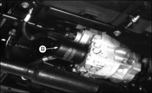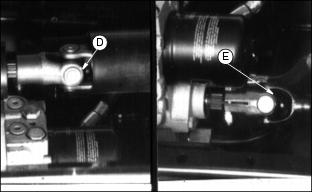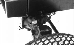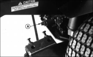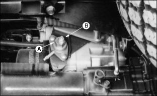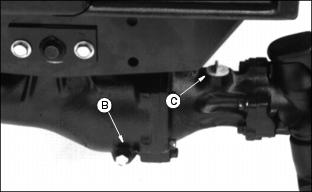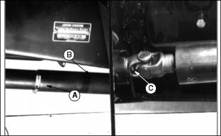 Transmission and Hydraulic OilUse oil viscosity based on the expected air temperature range during the period between oil changes. John Deere HY-GARDŽ is recommended. Other oils may be used if they meet the following: GreaseUse grease based on the expected air temperature range during the service interval. The following greases are preferred: ˇ John Deere MOLY HIGH TEMPERATURE EP GREASE ˇ John Deere HIGH TEMPERATURE EP GREASE Other greases may be used if they meet one of the following: ˇ SAE Multipurpose EP Grease with a maximum of 5% molybdenum disulfide Greases meeting Military Specification MIL-G-10924F may be used as arctic grease. Alternative And Synthetic LubricantsConditions in certain geographical areas may require lubricant recommendations different from those printed in this operator's manual. Some John Deere lubricants may not be available in your location. Consult your John Deere dealer to obtain information and recommendations. Synthetic lubricants may be used if they meet the performance requirements as shown in this operator's manual. Transmission Neutral AdjustmentThis adjustment should be done ONLY if the machine "creeps" when pedals are in NEUTRAL. NOTE: If creep is intermittent, inspect transmission control linkage for wear or damage or return to neutral linkage for binding before adjusting transmission neutral.. 1. Lift machine with a hoist and support both front and rear wheels off the ground. 2. Put jackstands under frame and rear axle. 3. Locate eccentric nut for adjustment on behind right front tire under machine. 4. Loosen lock nut (B). Loosen nut only enough to allow eccentric nut to turn. 5. Have someone push down center of seat cushion to activate seat safety switch, or use a jumper wire to bypass the seat switch. DO NOT SIT ON SEAT. 6. Start engine and run at low idle. Put transaxle in HI range. 7. With brakes DISENGAGED, turn eccentric nut (A) forward and backward until drive wheels stop turning. NOTE: Eccentric nut MUST BE positioned rearward and eccentric positioned forward for correct adjustment. 8. Hold adjustment and tighten lock nut. Make sure adjustment did not change. 9. Put transaxle shift lever in NEUTRAL. Depress both forward and reverse speed pedals, then release. 10. Again put transaxle in HI range. Check neutral adjustment. Repeat adjustment until drive wheels stop turning. 11. If drive wheels continue to turn when in NEUTRAL, lower machine to the ground. Remove seat switch jumper wire, if used. 12. Check for worn or binding return-to-neutral linkage or too light of tension on neutral return spring. If machine STILL "creeps" when in NEUTRAL, see your John Deere dealer. Check Transmission/Hydraulic Oil LevelUse ONLY John Deere Low Viscosity HY-GARDŽ (J20D) Transmission/Hydraulic Oil. Check oil when transmission is cold. 1. Park Front Mower on a level surface. 2. STOP the engine. Lower attachment to the ground. 3. Lift seat. Remove and clean dipstick (A). 4. Install dipstick but do not turn it. Oil should be in (XXX) area on dipstick, but not above top mark. Do not run engine if oil is below bottom mark. Change Transmission Oil And FilterUse ONLY John Deere Low-Viscosity HY-GARDŽ (J20D) Transmission/Hydraulic Oil. 1. Park Front Mower on a level surface. 2. Run engine to warm oil. STOP engine. 3. Remove drain plug (A) and plug on right side of transmission. 4. Change filter (B) while oil is draining. 5. Fill filter half full of oil. 6. Install filter quickly. Turn it until seal contacts base, then turn it BY HAND 1/2 turn more. 7. Remove three bolts (C), housing and screen. 11. Start engine. Check for leaks around drain plugs and filter. 12. Move lift lever back and forth several times. 13. STOP engine. Check oil level. MRWD OilJohn Deere GL-5 Gear Lubricant is recommended. Other oils meeting one or more of the following may be used: ˇ Military Spec MIL-L-2105B or C or D Use MIL-L-10324A oil below -10°C (+14°F). Check MRWD Oil Level1. Park Front Mower on a level surface. 2. Remove and clean dipstick (A). 3. Install dipstick but do not turn it. 4. Remove dipstick. Check oil level. 5. Oil should be in (XXX) area on dipstick but not above top mark. If oil is low, do not operate Front Mower. Change MRWD Oil1. Change oil right after operating Front Mower, while oil is warm. 2. Remove drain plug (A) from each side. 3. Remove plug (B), and dipstick (C). 4. After oil is drained, install plugs. 5. Install 2.1 L (2-1/4 qt) oil. Allow time for oil to drain into outer housings. Lubricate U-JointsC - MRWD Shaft (Front U-Joint) 2. Slide tube (B) to lubricate points (C) and (D). 4. Lubricate all points with arctic grease when below -30°C (-22°F). |