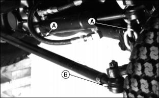 Service Steering & BrakesGreaseUse grease based on the expected air temperature range during the service interval. The following greases are preferred: ˇ John Deere Moly High Temperature EP Grease. ˇ John Deere High Temperature EP Grease. Other greases may be used are: ˇ SAE Multipurpose EP Grease with 3 to 5 percent molybdenum disulfide. ˇ Greases meeting Military Specification MIL-G-10924C may be used as arctic grease. Lubricate Pivot PointsLubricate the following points with John Deere multipurpose grease or an equivalent. Lubricate Steering Cylinder And Tie RodLubricate steering cylinder (A) in two places and tie rod (B) with John Deere multipurpose grease or an equivalent. Adjusting Turn Brakeˇ Adjust brakes when they are uneven or do not respond. When brakes cannot be adjusted by turning the turnbuckle, see your John Deere dealer. ˇ Adjust right turnbuckle (A) for right brake. Adjust left turnbuckle (A) for left brake. |