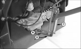 Mantenimiento - TransmisiónReemplazo de la correa de la transmisión1. Quitar el embrague a la correa impulsora (A) de la plataforma cortadora. (Ver Reemplazo del embrague a la correa impulsora de la plataforma cortadora en la sección Mantenimiento - Cortadora.) 2. Desconectar el conector eléctrico del embrague de la PTO (B). 4. Mover la rueda guÃa (D) para extraer la correa impulsora vieja. Instalar la nueva correa impulsora de la transmisión. 5. Mover la rueda guÃa (D) según se requiera para apretar la correa impulsora nueva y apretar la tuerca (B). 6. Revisar la tensión de la correa impulsora y ajustar si es necesario. (Ver Ajuste de tensión de la correa impulsora de la transmisión, en esta sección) 7. Conectar el conector eléctrico del embrague (B). 8. Instalar el embrague a la correa impulsora (A) de la plataforma cortadora. (Ver Reemplazo del embrague a la correa impulsora de la plataforma cortadora en la sección Mantenimiento - Cortadora) Ajuste de tensión de la correa impulsora de la transmisión