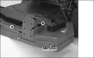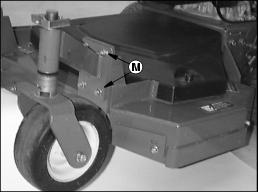 NOTE: The caster wheel brackets must be attached to the mower deck in the upper set of mounting holes (M).