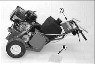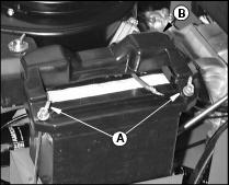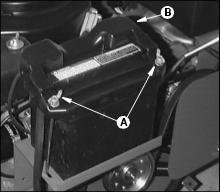 12. Install battery cover (B) and tighten wing nuts (A) just tight enough to hold down battery.