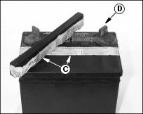 4. Remove protective plastic cover (D) from the positive (+) battery post.