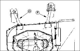 6. Connect both caster wheel supports (O and P) to mounting holes in the mower deck frame using eight M8 carriage bolts and M8 locknuts. Tighten locknuts to 25 N·m (18.5 lb-ft).