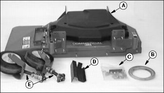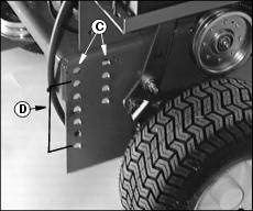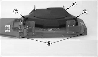 NOTE: Align mower deck mounting brackets (E) with the top set of mounting holes (C). Disregard all the different mounting holes (D) in the power deck frame. They are not used in this application.