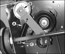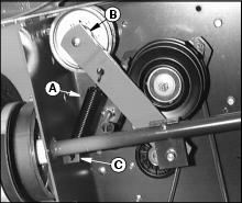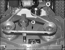 · Install drive belt over mower deck drive sheaves and at the same time pull spring loaded idler arm (B) to loosen belt tension.