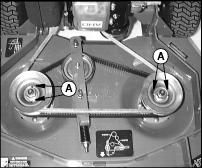 3. For a quick check on mower deck timing, sheave drain holes (A) should be approximately 90° from each other.