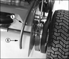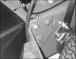 5. Install belt shield (E). When a 36-Inch Mower is attached to a power unit equipped with electric start, route the battery vent hose (F) between frame and belt cover.