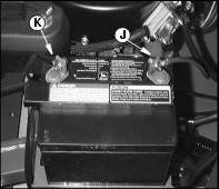 · Connect red positive (+) cable (J) to battery using one M6 screw and M6 hex nut. Make sure connection is tight.