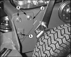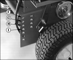 5. Connect mower deck (J) to mounting holes (F,G,H or I) in the power unit frame using: