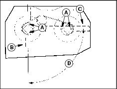 2. A properly timed mower deck must have the mower blades (B) and (C) at 90° (D) from each other.