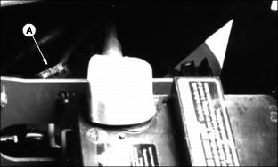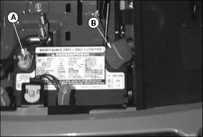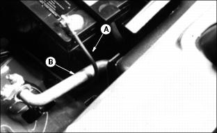 IMPORTANT: Avoid damage! Make sure negative (-) Black battery cable (A) is routed under rod (B) as shown.