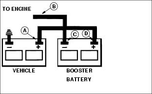 Connect positive (+) booster cable to booster battery positive (+) post (D).