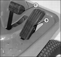 · Take foot off accelerator (B) and push in brake pedal (C) to come to a complete stop.