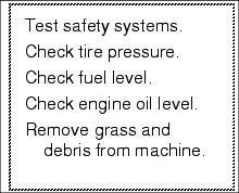 · Inspect machine before you operate. Be sure hardware is tight. Repair or replace damaged, badly worn, or missing parts. Be sure guards and shields are in good condition and fastened in place. Make any necessary adjustments before you operate.