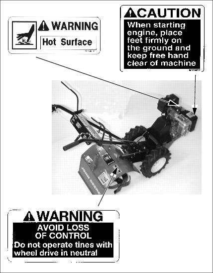 Safety SignsSafety-Alert SymbolRead and recognize safety information. Be alert to the potential for personal injury when you see this safety-alert symbol. On your machine safety labels, the words DANGER, WARNING, and CAUTION are used with this safety-alert symbol. DANGER identifies the most serious hazards. In this manual, the word CAUTION and this symbol call attention to safety messages. Machine Safety LabelsM86673, M88081, M88080, M88082 Certification LabelThis OPEI label on your tiller indicates that this model has been certified by an independent laboratory for compliance with American National Standard B-71.8-1996, "Safety Specifications" for Tillers. |