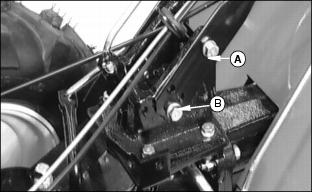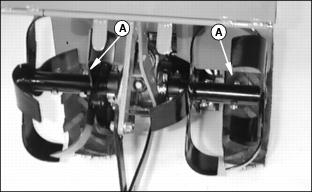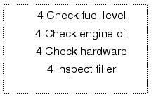 NOTE: The electric starter motor will shut off automatically if it overheats from cranking the engine. After the motor cools, it will operate again. ˇ Connect power cord to engine switch box (G). ˇ Plug other end of cord into three-hole, grounded 120-volt AC. receptacle. ˇ Push starter button (H) to start engine. ˇ Disconnect cord from house circuit FIRST. Then disconnect cord from switch box. ˇ Move choke lever (E) to 1/2 choke until engine runs smoothly. ˇ Move choke lever to "RUN" position. 10. Move throttle lever (C) to the desired engine speed. Stopping Engine1. Release Main Clutch (A) or (B). Clutch is spring loaded and will return to "N" neutral position. ˇ Forward or reverse motion will STOP. ˇ Tiller tine motion will STOP. ˇ Engine will continue to run. 2. Move throttle lever (C) toward the "SLOW" (t) position. ˇ Allow engine to run for a minute or so that it can cool down. ˇ Move throttle lever to the "STOP" position, engine will stop. 3. Move ON/OFF switch (D) to the "OFF" position. Emergency StoppingTo stop tiller in an emergency: ˇ RELEASE ALL LEVERS (A or B), this will stop tiller forward or reverse motion and the tine motion. ˇ Move throttle lever (C) to the "STOP" position, engine will stop. DAILY OPERATING CHECKLISTOperate TillerFollow tiller operating sequence as follows: 1. Release main clutch levers. 2. Select desired "IN" or "OUT" tine engagement position. 3. Select fast (r) or slow (t) wheel drive speed. Adjust Tilling Width1. Stop engine prior to adjusting tine width. 2. Outer tines can be removed by removing nuts and bolts (A). 3. When installing outer tines, make sure all dirt is removed from inside tube. 4. Install and tighten hardware. Transporting TillerTRANSPORTING A SHORT DISTANCE: ˇ When transporting unit to and from area to be tilled. ˇ Lower depth control to lowest notch to raise tines off ground. ˇ Put wheel drive lever in the "r" fast position. ˇ Lift up on handlebars enough to raise tines slightly off surface. ˇ Engage main clutch "F" top levers to propel unit. ˇ DO NOT engage tine clutch while transporting. ˇ When transporting this tiller on a trailer or in a truck, make sure unit is secured to prevent it from sliding or tipping over. ˇ Move fuel shut off valve (A) to the CLOSED (OFF) position (B). (See Using Fuel Shut Off Valve in this section). Tilling TipsPractice operating controls and running tiller (with tines out of the ground) before starting to till. When tilling for the first time, set depth control in second notch to a tilling depth of 12 - 25 mm (1/2 - 1 in.), just enough to break hard soil crust or sod. NOTE: Tilling depth will vary with ground conditions. Using the depth control will help maintain a constant tilling depth. Prior to engaging the Main Clutch, hold handlebars up to keep tines out of the soil. Slowly lower tines into soil and begin tilling operations. You don't need to exert pressure or weight on handlebars while you are tilling. Heavy pressure on handlebars will cause tines to try to propel tiller instead of digging. Keep both hands on handle grips when tilling to maintain balance and direction of tiller. When reaching the end of a row, lift handlebars to raise tines out of the ground. Push handlebars to right or left so tiller turns in desired direction. If loss of control occurs because of the tines impacting hard ground or hidden objects DO NOT attempt to force the tines down by hanging on the handlebar. Let go of the handlebars and do not restrain machine. Stand clear of the rotating tines until tines stop. Re-establish control by lifting upward on the handles to remove tines from the soil. Don't let crop residue, rye grass, stringy stalks, vines, etc., build up to a point where it chokes off action of tines. Reverse the tiller to unwind and reduce amount of tangle.